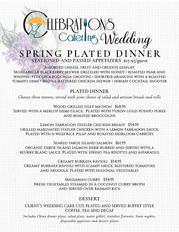 Whether you are planning an indoor or outdoor reception, Celebrations catering can accommodate your every need. From salad to dessert, highlighted by an elegantly displayed entrée, Celebrations will work with you to make your formal event one to remember with a delicious plated meal everyone will enjoy.